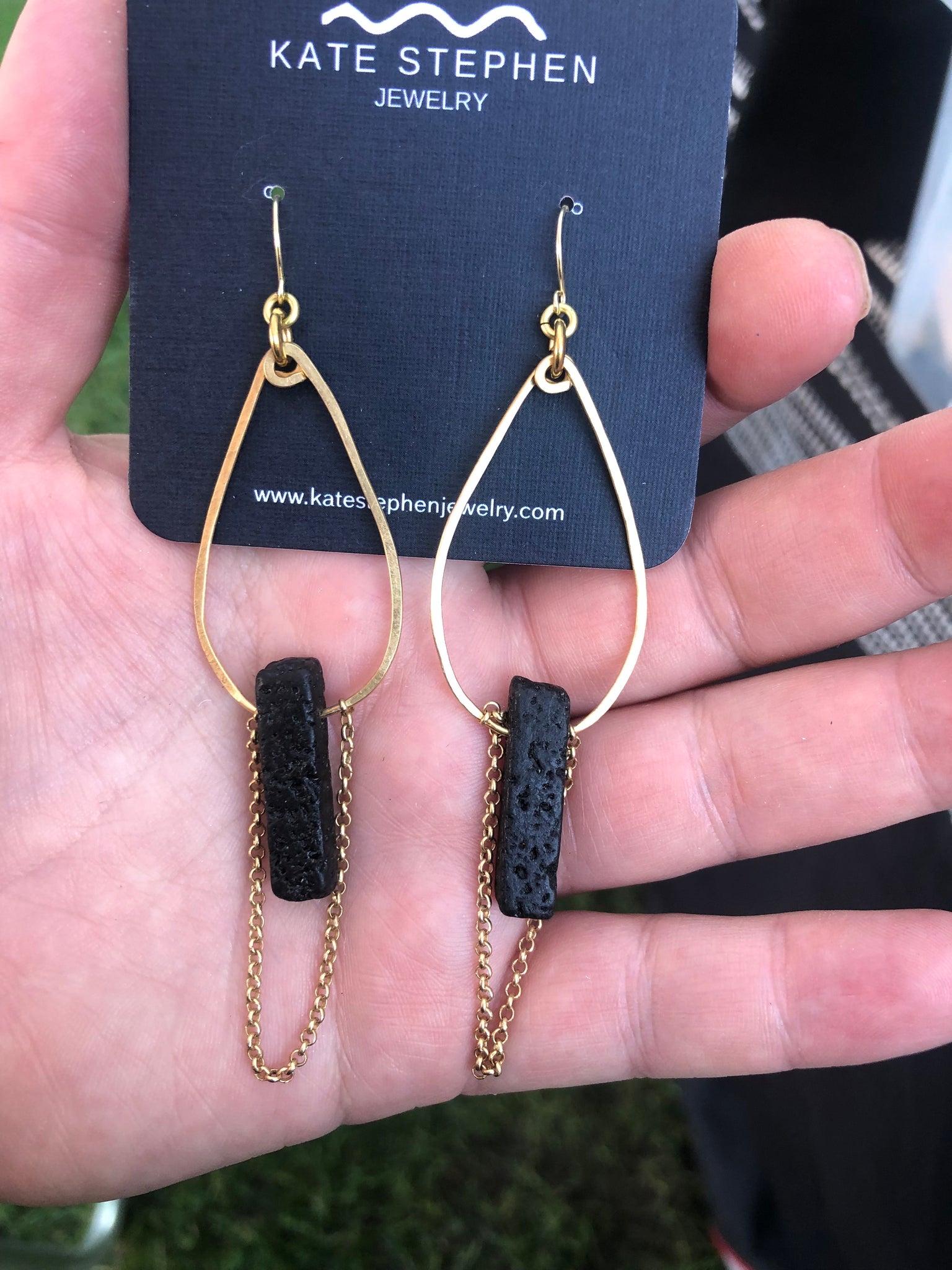 These are so sleek! Gorgeous organic black lava stone suspended from a hammered brass hoop with a cool slinky brass chain.