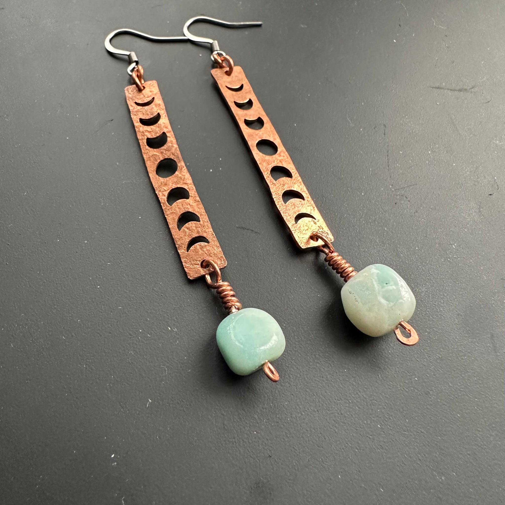 Gorgeous hammered phases of the moon drop earrings with a piece of blue amazonite.